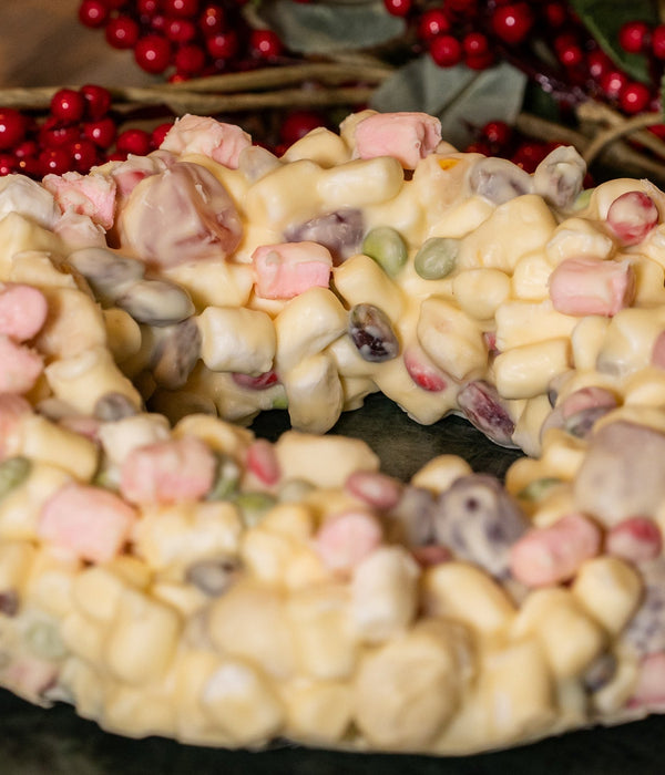 Mix all ingredients together (save a few FruChocs and pistachios for decorating)