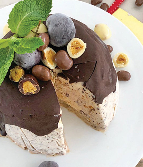 To finish, decorate with a drizzle of chocolate sauce and apricot jam.